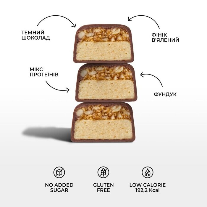 | мікс протеїнів 23,5% (сироватковий, гідролізований колаген, казеїновий, соєвий), борошно фундучне, клітковина тапіоки, фінік в'ялений, фундук подрібнений, шоколад темний (какао терте, цукрозамінник мальтитол), какао масло, соєвий лецитин, натуральний ароматизатор ванілі, вода питна, какао масло, цукрозамінник 0,3% (розчинна клітковина рослинного походження, клітковина кукурудзи та цикорію, підсолоджувачі: ізомальт, ери). |